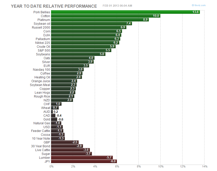 With January over the table below shows the best and worst markets so far in 2013. With Financial Spread Betting via a firm such as IG Index, City Index, Capital Spreads or Cantor Index it is possible to speculate on a vast range of markets including Pork Bellies, Cotton and Platinum. You can also trade global indices such as the Dow Jones, Nikkei 225 and S&P500. Foreign Exchange or FX also remain popular financial spread bets with the Yen continuing to be weak you can short the Yen against various currencies such as the GBP, Euro or US$. Those outside the UK can also use Contracts For Difference (CFDs) which are now popular in Europe and Australia.