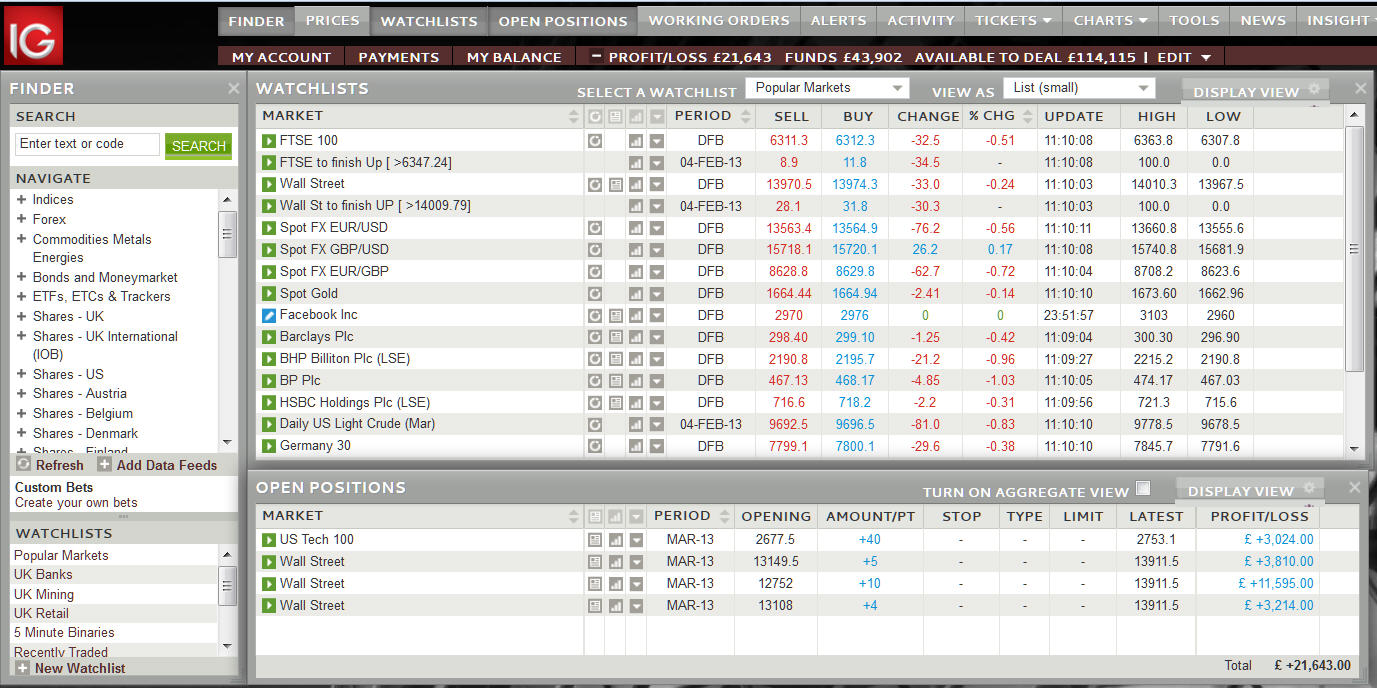 The screen below is my actual live Account with IG Index. With Financial Spread Betting you can place bets on a massive range of shares, commodities, currencies and indices all from one account, with many markets being open 24 hours a day. You can also trade in the currency of your choice, in this example I am using £ per point even though I have bets open on US indices.
