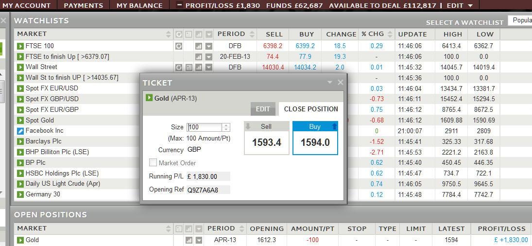 Whilst the last decade has been good for Gold bulls we have also had some very good opportunities to make money from falling gold prices. One of the easiest ways for those in the UK is to use Financial Spread Betting. For example IG Index are currently quoting 1593.4 to sell and 1594.0 to buy so if we went to back a view that Gold is going lower we would sell at 1593.4 in this example I have gone short £100 a point (the minimum is £10 with IG Index).