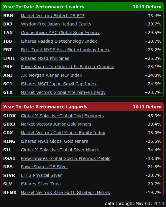 As you can see Biotech has been a very strong sector so far in 2013 and Gold miners have been the laggards. Another strong market – region this year has been Japan which is trying to stimulate its economy after years of little growth.